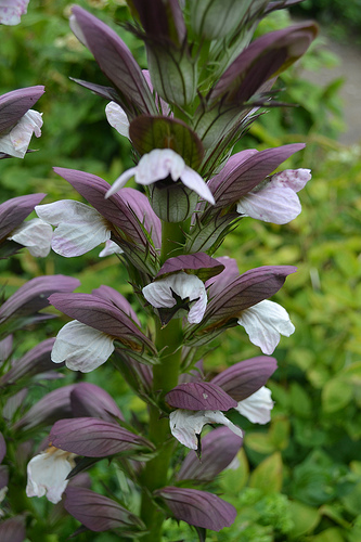 Acanthus mollis White Lips - компактное растение, идеально подходит для небольших садов. Стебель толстый, темно-зеленый. Розетка листьев темно-зеленого цвета. Цветки представлены пурпурными и светло-фиолетовыми лепестками. Период цветения - конец весны.