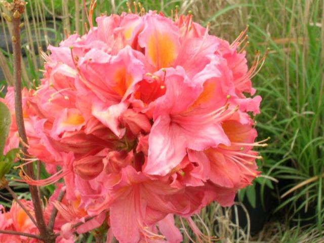 Азалия (рододендрон листопадный) Pink Delight - листопадный кустарник с густой, широкой кроной. После 15 лет достигает заявленный рост. Данный сорт устойчив к болезням и вредителям. Поливается 1-2 раза в неделю. В высоту достигает до 1,7 метра. В диаметре обычно до 1,4 метра. Цветки розовые с желтыми пятнышками 8 см в диаметре. Морозостойкость -29С.