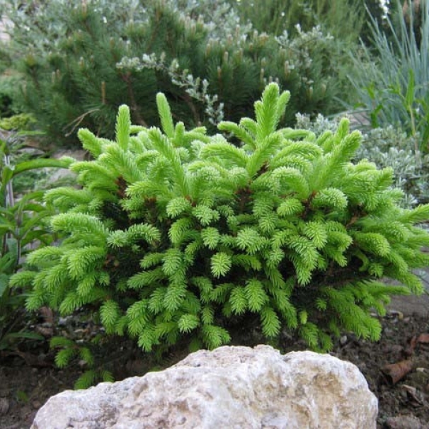 Ель обыкновенная Pumila Nigra - стелющийся хвойный кустарник с плоской, густой кроной, с темным цветом хвои. Растет медленно. В 10 лет диаметр кроны 0,5-0,7 м. 30-летние экземпляры достигают в высоту 1,3 м. Старые растения очень широкие, часто ломаются и выглядят как состоящие из нескольких растений. Нижние ветви расположены низко и стелются по земле, верхние направлены наверх и в стороны. Побеги тонкие, гибкие. Хвоя короткая, узкая, плоская, длиной 12 мм, темно-зелёная.