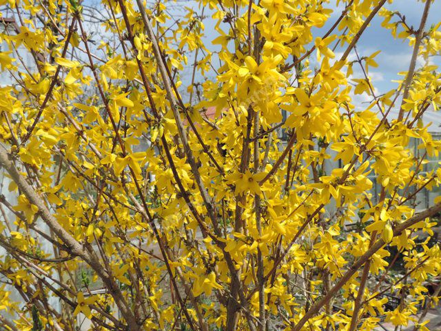 Форзиция Микадор - листопадный кустарник с супротивными листьями. Очень обильно цветущий сорт форзиции. Высота до 1,5 м. Цветки темно-желтого цвета, распускаются весной до появления листьев, цветение обильное. Предпочитает плодородные почвы. Не выносит длительной засухи. Нуждается в посадке на солнечном, защищенном от северных ветров месте. Форзиция хорошо зимует и весной обильно цветет, если на зиму кусты пригибать к земле, чтобы ветви были укрыты снегом до наступления сильных морозов. Используется как ранне- и красиво цветущий кустарник при создании весенних композиций