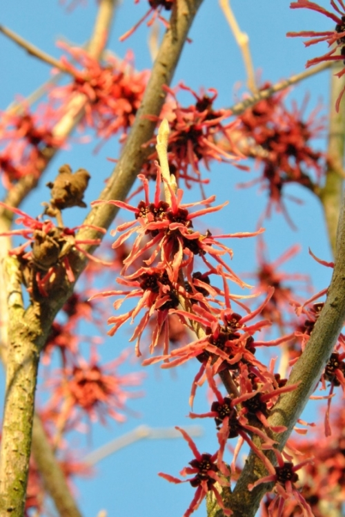 Гамамелис (волшебный орех) Ruby Glow - сорт гамамелиса промежуточного. Листопадный кустарник или небольшое дерево до 3 м высоты. Ветви раскидистые или восходящие до прямостоячих. Листья до 16 см длины, широкояйцевидные или эллиптические, осенью окрашивающиеся в оранжевый, бронзовый и шарлаховый цвет. Цветки ароматные, медно-красные, с желтыми верхушками лепестков. Лепестки до 2 см длины, узкие и длинные, лентовидные, раскидистые, прямые или чаще слабо изогнутые. Сорт устойчив к болезням и вредителям.