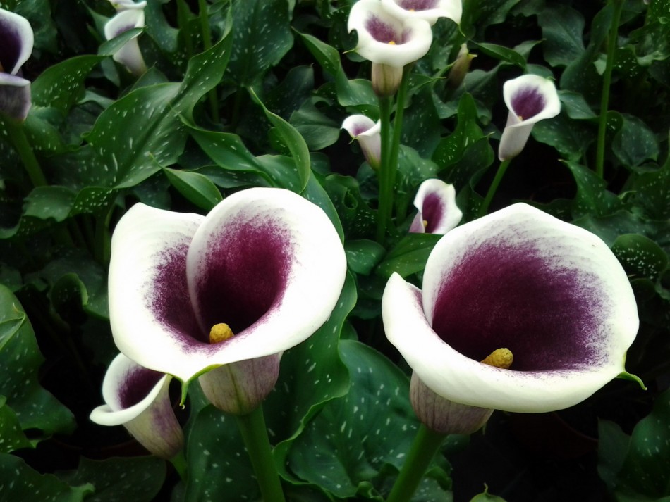 Необычная расцветка этого тропического растение привлечет внимание любителей цветов – шикарная Калла Пикассо (Calla Picasso) обладает необычайном окрасом. В глубине белого бутона затаилась синева ночного неба, по листьям растения рассыпались белые капельки крапа. Растение настолько декоративно, что сразу же привлекает внимание. Выращивать этот сорт можно в открытом грунте и горшках, любит обильный полив. Предпочитает немного затененные места, хорошую почву и дренажом. В открытый грунт высаживается только после последних морозов. После цветения желательно удалять лишние листья. Красива в одиночных посадках и клумбах.