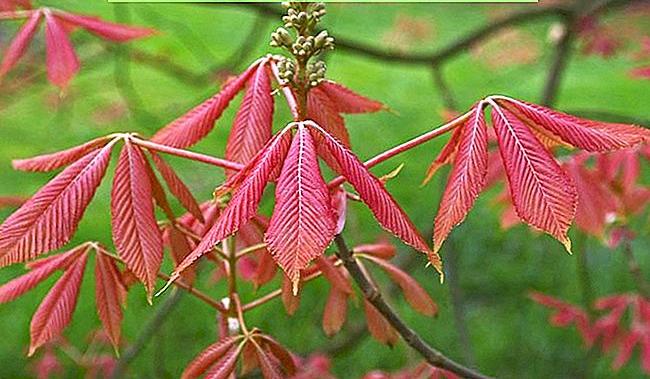 Каштан конский Эрисробластос - эффектное, довольно медленно растущее и широколистное дерево. Заостренные, мелкозубчатые листья становятся ярко-розовыми, позже желтыми, затем темно-зелеными, осенью переходя в яркие оттенки оранжевого и красного. Маленькие кремово-белые цветки окрашены в розовый цвет, которые появляются в вертикальных метелках в мае. Плоды образуются редко.