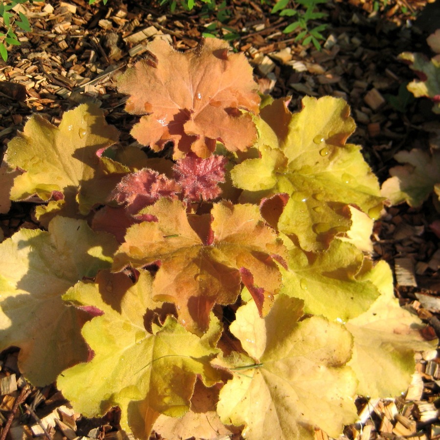 Гейхера (Хеухера) гибридная Биг Топ Голд (Heuchera hybrida Big Top Gold) отличается необычной расцветкой одного куста. Цвет широких волнистых листьев меняется от коричневого и темно-желтого до розового и темно-красного, причем обратная сторона у всех темно-розовая. Высота растения 35 см, равна ширине куста. Подходит для использования в качестве почвопокровной зелени, ковровых посадок и обрамления широких садовых дорожек. Цветет мелкими кремовыми цветами ближе к середине лета, они практически не заметны на фоне листьев. Гейхера (Хеухера) гибридная Биг Топ Голд - тенелюбивое растение для суглинистых плотных почв с достаточным количеством воды.