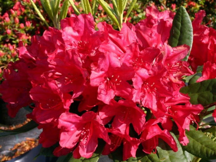 Рододендрон Hachmanns Feuerschein - цветы красные, блестящие. Сильно бликуют даже в тени, потому трудны в фотографировании. Производят впечатление более плотных и, как бы, восковых. Иногда развивают побеги и из вершины соцветий. Цветение июнь.