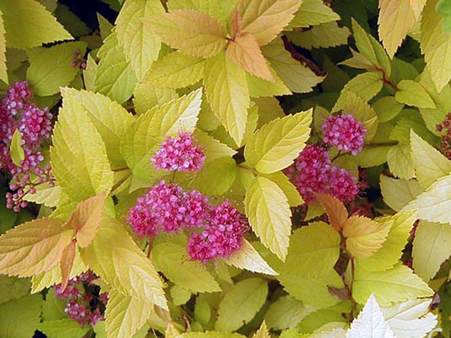Спирея японская Candlelight - компактный округлый карликовый кустарник не превышающий 50 см. Листья яйцевидные, заостренные сливочно-желтого цвета, летом ярко-желтые, очень красиво контрастируют с ярко-розовыми соцветиями, обильно покрывающие куст с июня по август. Осенью становится оранжево-красными. Эта спирея светолюбива, к почвам нетребовательна, морозостойкая, дымо- и газоустойчива.