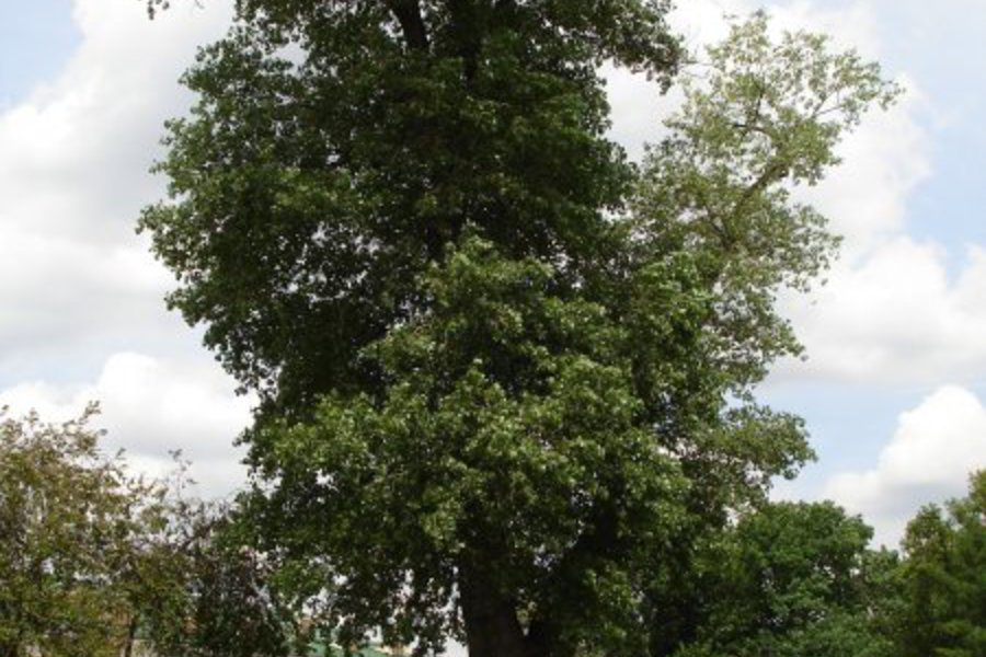 Тополь берлинский - дерево высотой до 25—35 м. Крона широко-пирамидальная, состоящая из относительно тонких ветвей. Нижняя часть ствола с тёмно-серой, глубоко трещиноватой корой. Побеги оливковые, сперва ребристые, позже цилиндрические. Почки крупные, остроконические, с тёмно-бурыми верхушками, почти не клейкие. Листья яйцевидные, длиной 8—15 см, шириной 5—7 см, с длинной вершиной, сверху светло-зелёные и блестящие, снизу ещё светлее и матовые.