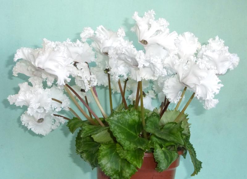 Цикламен европейский Вайт Ангел - цветки белые, с розовыми тенями и мелким крапом на верхних лепестках с мелкозубчатыми краями, у зева небольшое золотисто-желтое пятно.