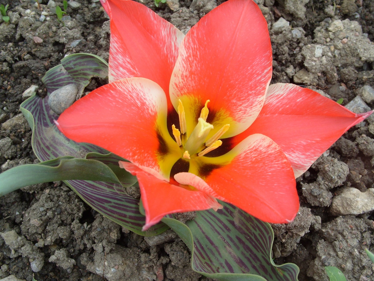 Сорт тюльпанов Али Баба низкорослый, но его очень любят цветоводы, потому что высаженный большими группами, он создает потрясающую картину в период цветения. Сорт Али Баба растет максимум до 20-30 см в высоту, он низкий, но с плотным, прямым стеблем. У цветка широкие прикорневые листья зеленого цвета с крупными, заметными темно-красными штрихами. Период цветения у этого сорта – около 3-х недель, начиная с первых чисел мая.