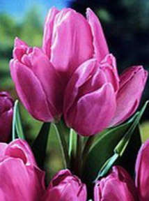 Тюльпан Purple Bouquet - поздний, многоцветковый сорт, на одном стебле обычно расцветает 4-6 цветков. Высота растения 45-50 см. Листья темно-зеленые. однотонные. Цветок бокаловидный, сиренево-фиолетовый, с пурпурным оттенком. Высота бокала 8-10 см. Размер луковицы 12 см. Цветет в мае. Продолжительность цветения - 2-3 недели.