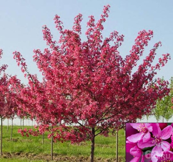 В течение мая (с начала до середины) яблоня обильно цветет: крупные темно-карминные или рубиново-красные бутоны становятся рубиново-красными или малиново-красными цветами с приятным ароматом.